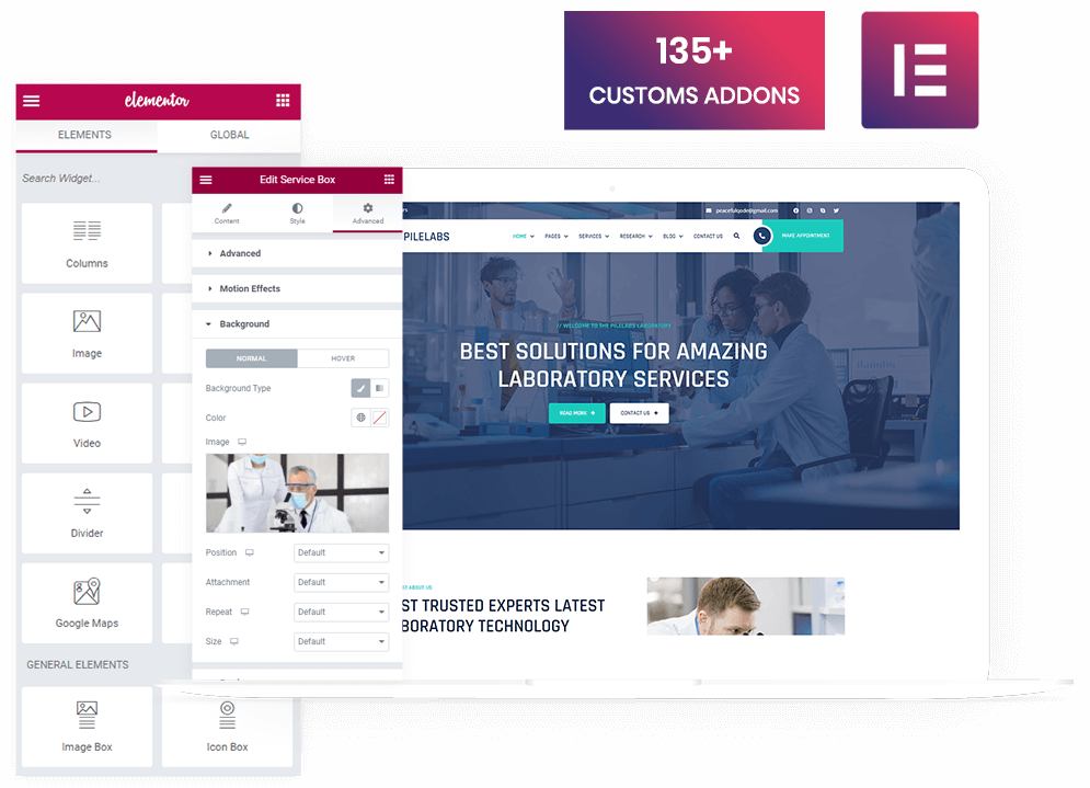 Elementor offers intuitive interface and flexibility. It is one of the most user-friendly page builders for WordPress. Customize your Pilelabs template with ease using a set of additional elements.